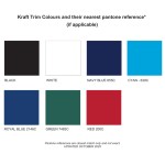 Black, Natural, Cyan, Green, Navy, Royal Blue, Red. See image for colour and closest Pantone match.