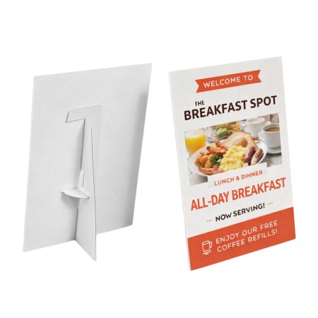 Printed strut cards for counter displays and point of sale. Supplied assembled, rigid and professional-ideal for retail, hospitality and events.